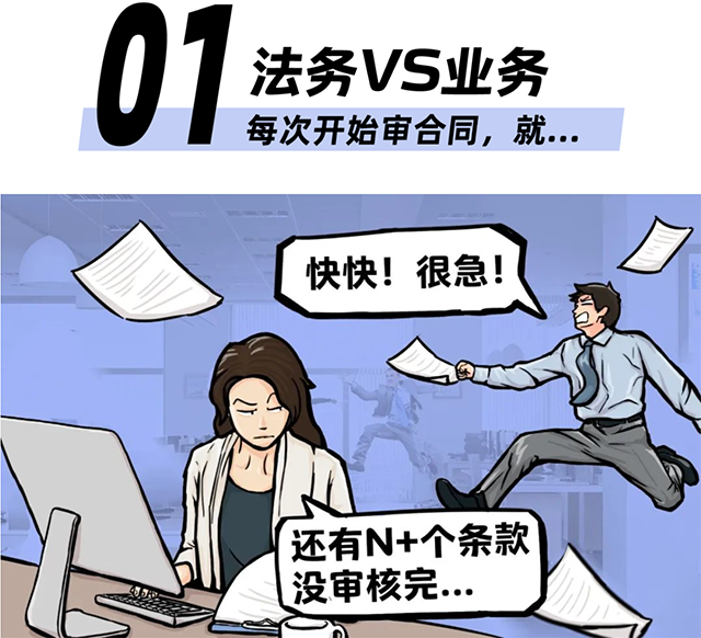 法务(内心OS):动辄接近100页的合同,每天少说也得十几份,业务部接连来催,有时甚至当场围观等我审核完。还最喜欢说“就看看表述”、“尽量别提意见”、“对方催得急”、“马上给签字”...条款写得不严谨、资料不全等问题一堆,难道是我想卡进度嘛。这还不算啥,最怕万一发生风险,背锅侠还得是我们啊,心累。