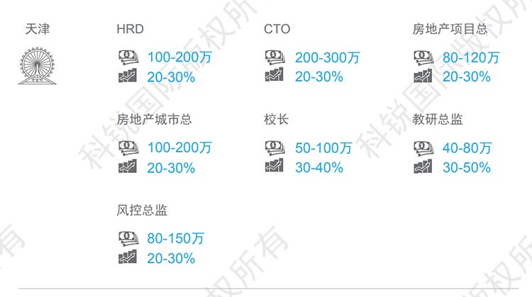 天津整体薪资呈现上涨的趋势,尤其金融、教育、高科技等行业,核心岗位如在线教育的教学教研岗、AI算法、底层开发架构等岗位跳槽涨幅可达30-50%。本数据来源于猎头公司南宫NG28(中国)国际资深行业专家对2021年热门职位薪酬范围及跳槽涨幅的预测,供HR和猎头招聘参考。